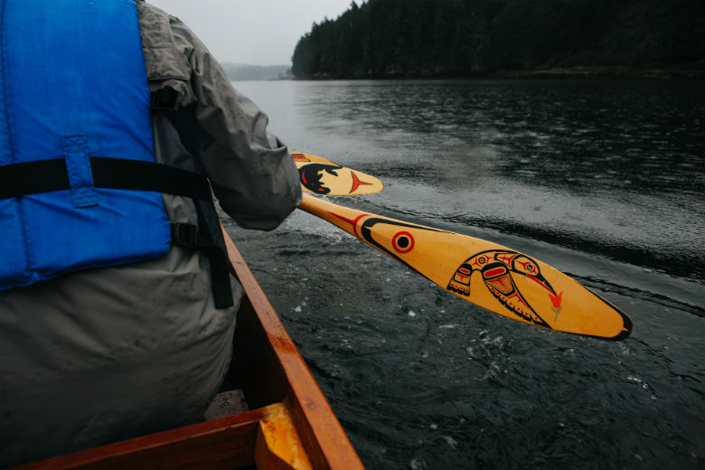 After lunch, we sang some songs from our nations, and headed back to the main island. Unlike our paddle to Saysutshun, which was in the morning, it was torrential downpour and made for a very interesting journey back. You can see the rain droplets on the ocean behind this beautiful paddle.