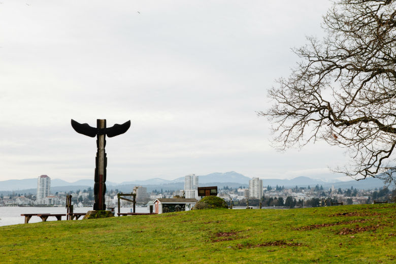 My classmates and I paddled from the harbour to Saysutshun, and were graciously welcomed by Snuneymuxw First Nation by this totem pole. Our host, who also provides guided tours of Saysutshun, shared the history and connections with this island.
