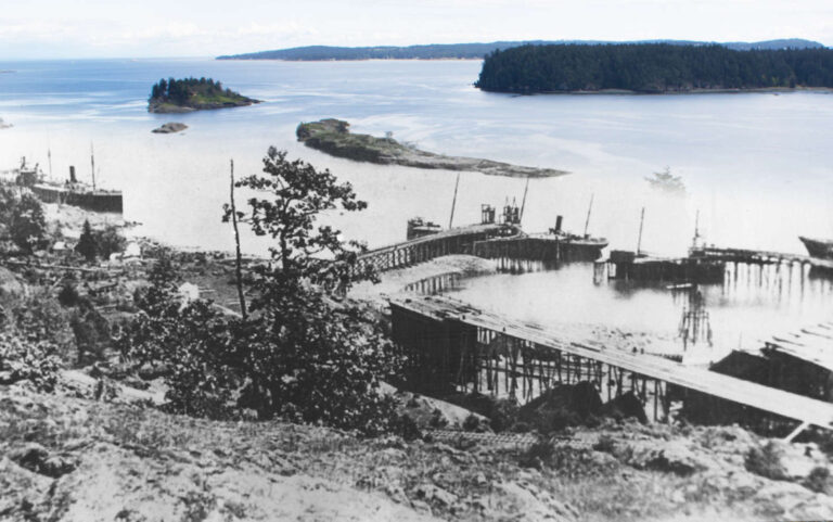 There are so many to choose from. There’s a striking photo of a group of militia in their colonial-era pith helmets milling about on Church Street during the brief period in 1913 when Nanaimo was under pseudo-military occupation to break a miners’ strike. Another favourite is a photo of two boys crossing Commercial Street, looking straight into the photographer’s lens over a century ago. The harbour is a central feature of Nanaimo, and a representative picture shows a majestic CPR steamship docked at the ferry terminal once located just beneath the Bastion. I also was fascinated by a view of Departure Bay from the top of Sugar Mountain, showing the huge coal wharves on the water’s edge, of which only the pilings remain today.